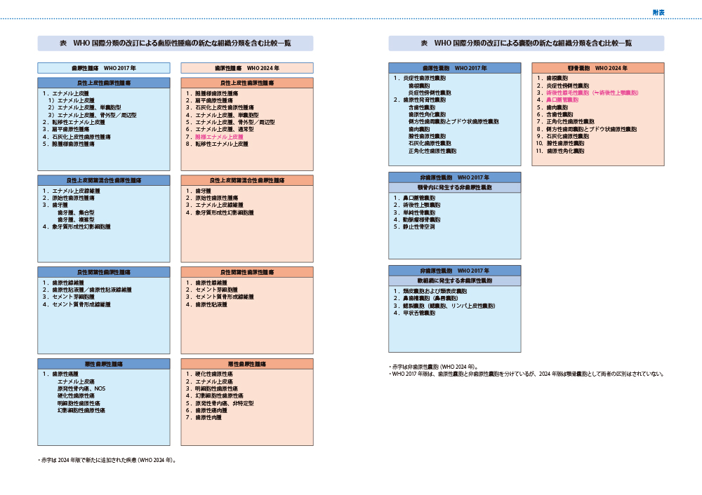 ・WHO国際分類の改訂による歯原性腫瘍の新たな組織分類を含む比較一覧 ・WHO国際分類の改訂による囊胞の新たな組織分類を含む比較一覧 ・WHO国際分類の改訂による唾液腺腫瘍の新たな組織分類を含む比較一覧